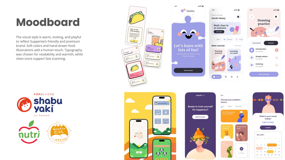Supperise is a personalized meal delivery app designed to surprise users with gourmet meals tailored to their dietary needs, flavour preferences, and lifestyle. The project focused on end-to-end product design—from research to a clickable prototype.